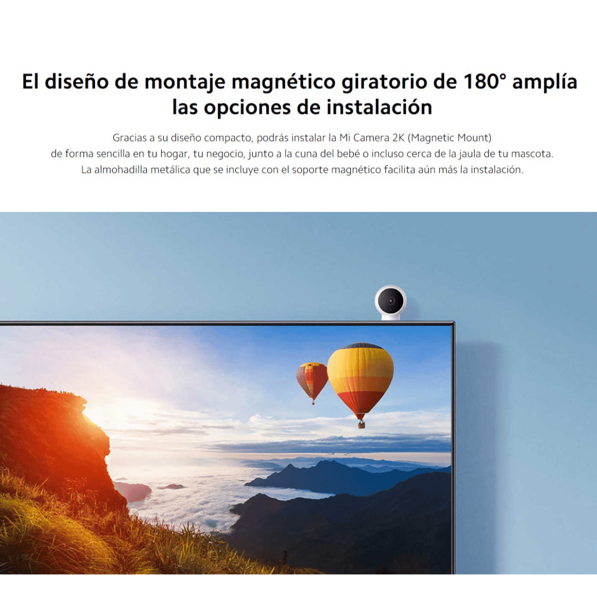 El soporte magnético giratorio de 180° le ofrece más opciones de instalación.El diseño compacto de Mi Camera 2K (montaje magnético) permite que seaSe instala fácilmente en casa, en tiendas, junto a cunas o incluso junto a jaulas para mascotas.La almohadilla metálica que viene junto con el soporte magnético facilita aún más la instalación.
