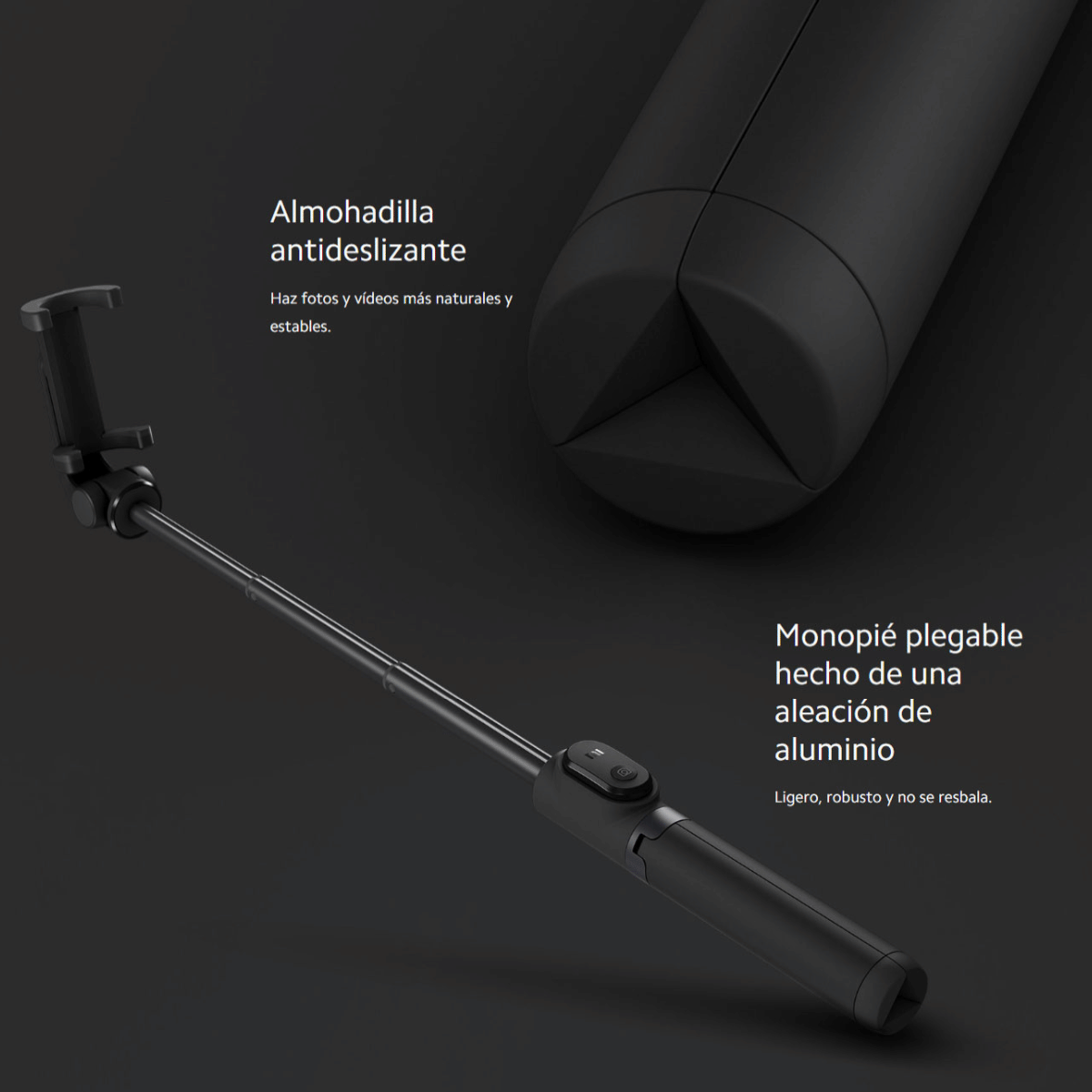 Formado por una sola unidad que integra un monopié y un trípode. Dispone de control remoto por bluetooth.