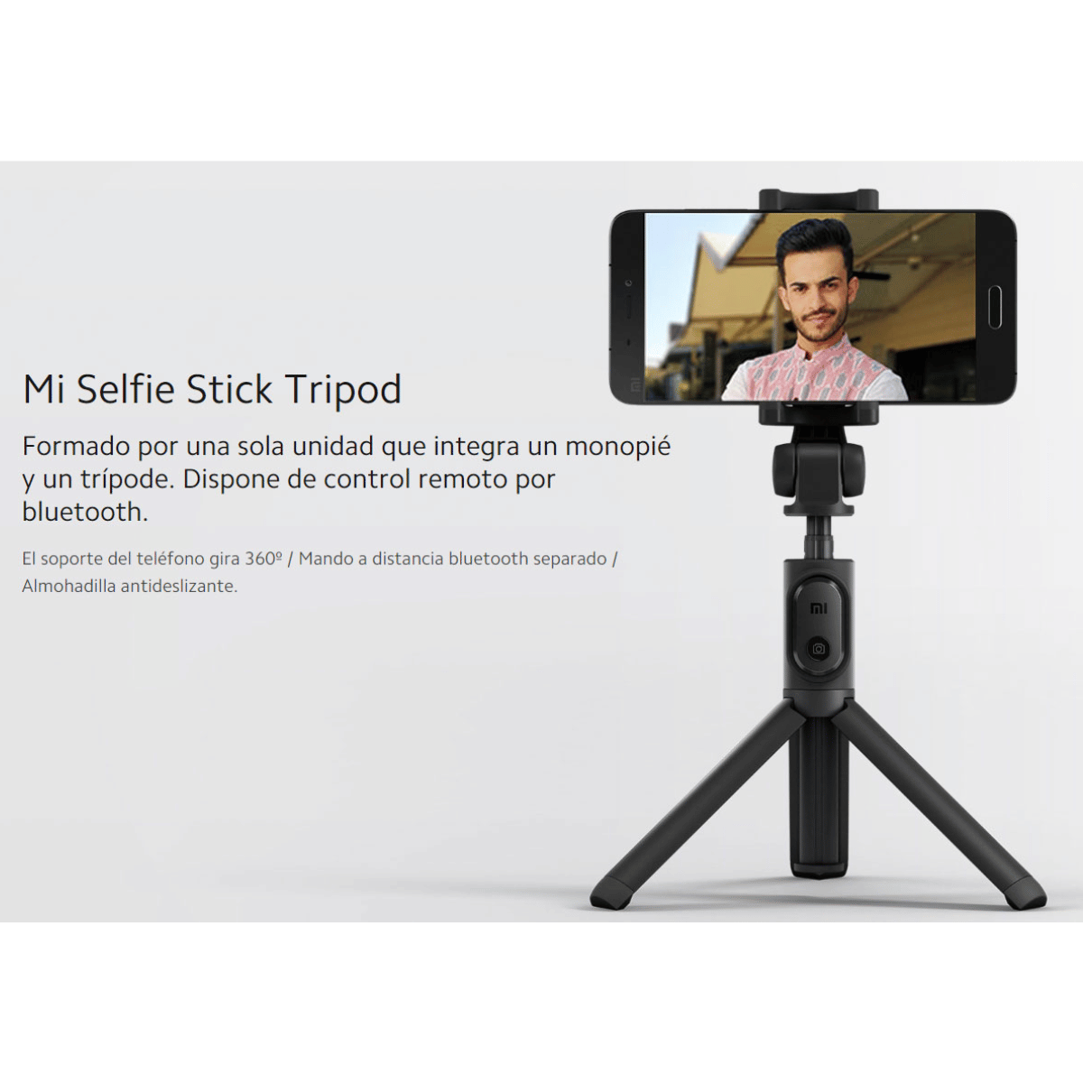 El soporte del teléfono gira 360º / Mando a distancia bluetooth separado / Almohadilla antideslizante.