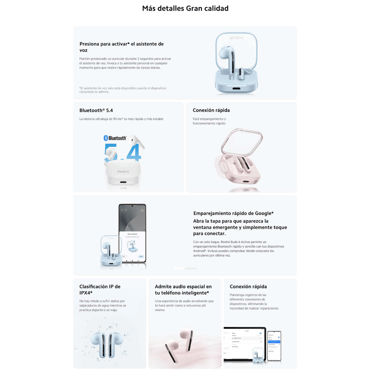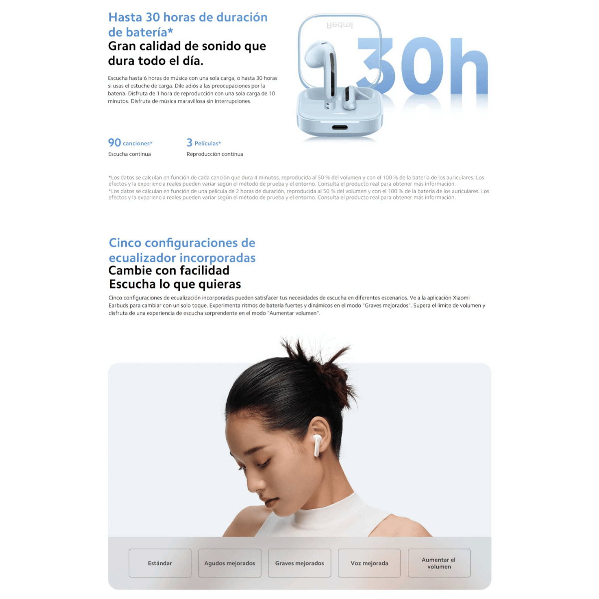 - Cinco configuraciones de ecualización: Cambia fácilmente entre modos como “Graves mejorados”, “Voz mejorada” y más, usando la aplicación Xiaomi Earbuds.