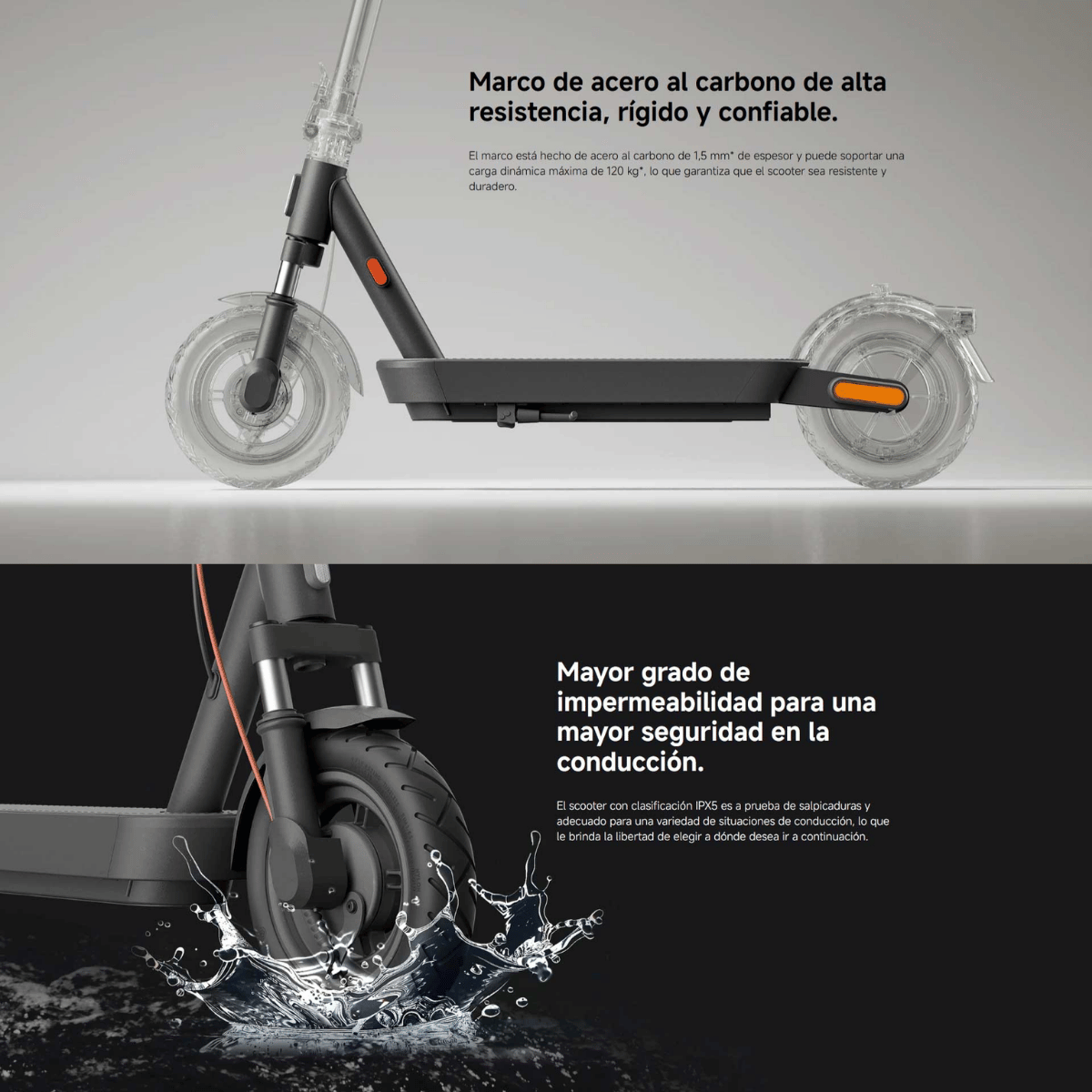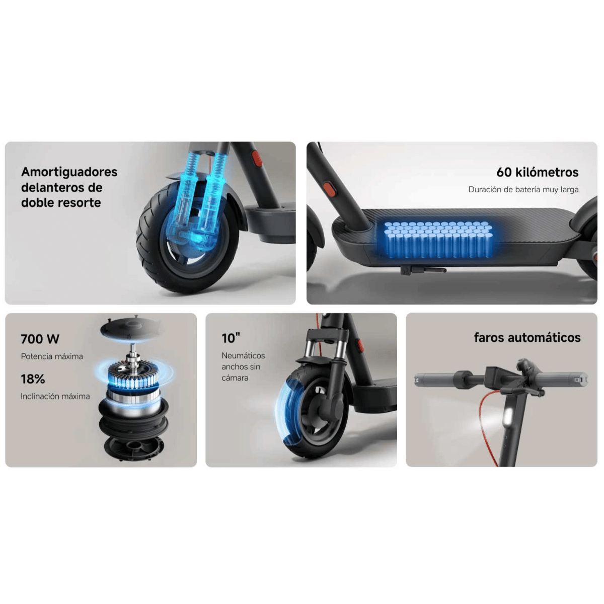- Neumáticos: 10” sin cámara, con mejor absorción de impactos y mayor tracción