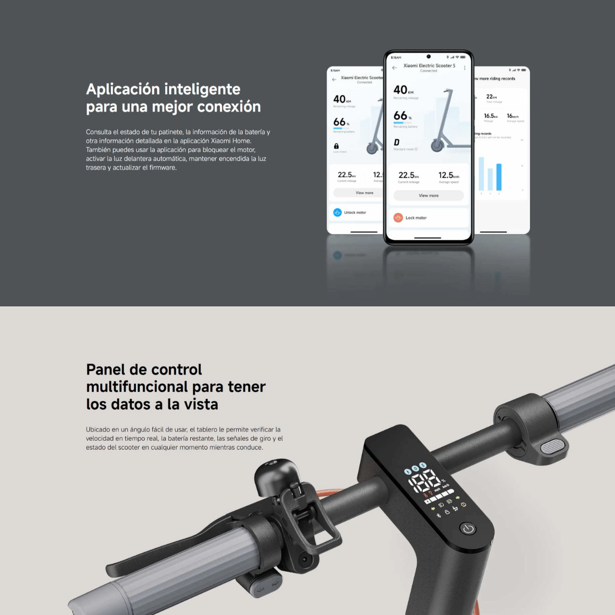 - Panel de control multifuncional: Muestra velocidad, batería, señales de giro y estado del patinete en tiempo real