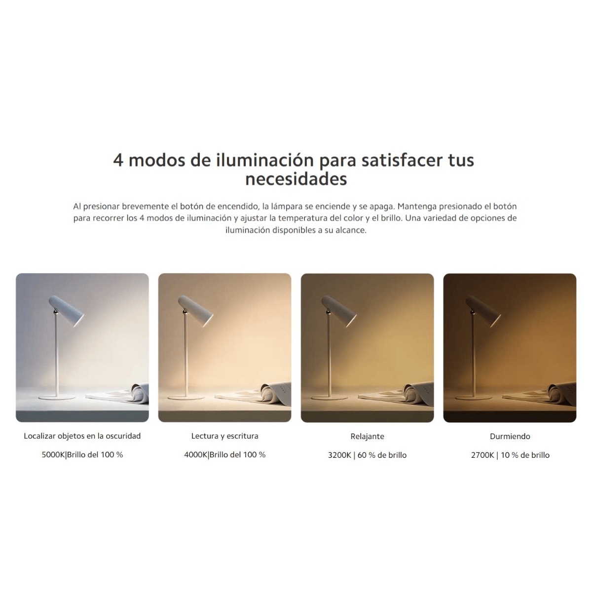 100 lm (4000 K, 5000 K), 60 lm (3200 K), 10 lm (2700 K)