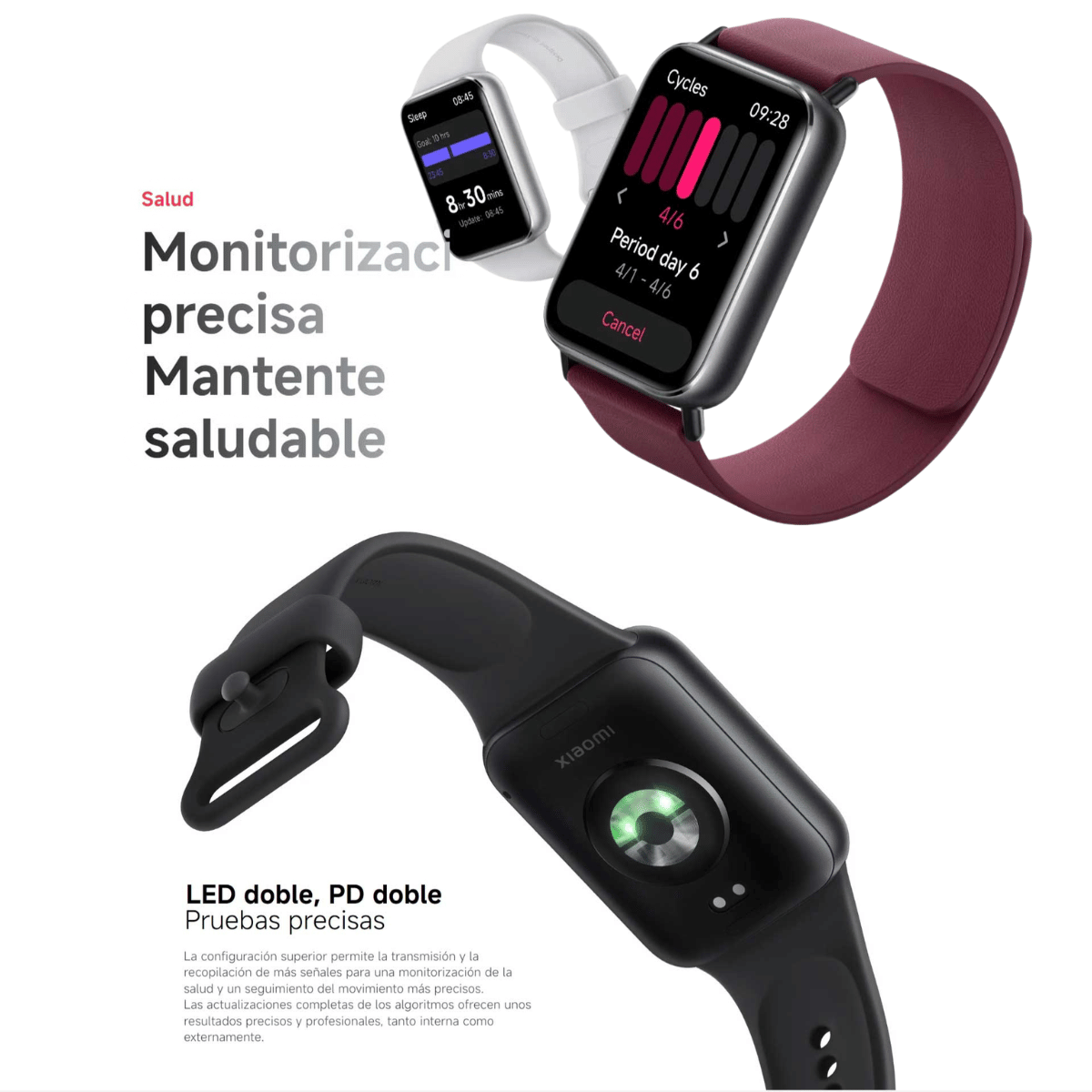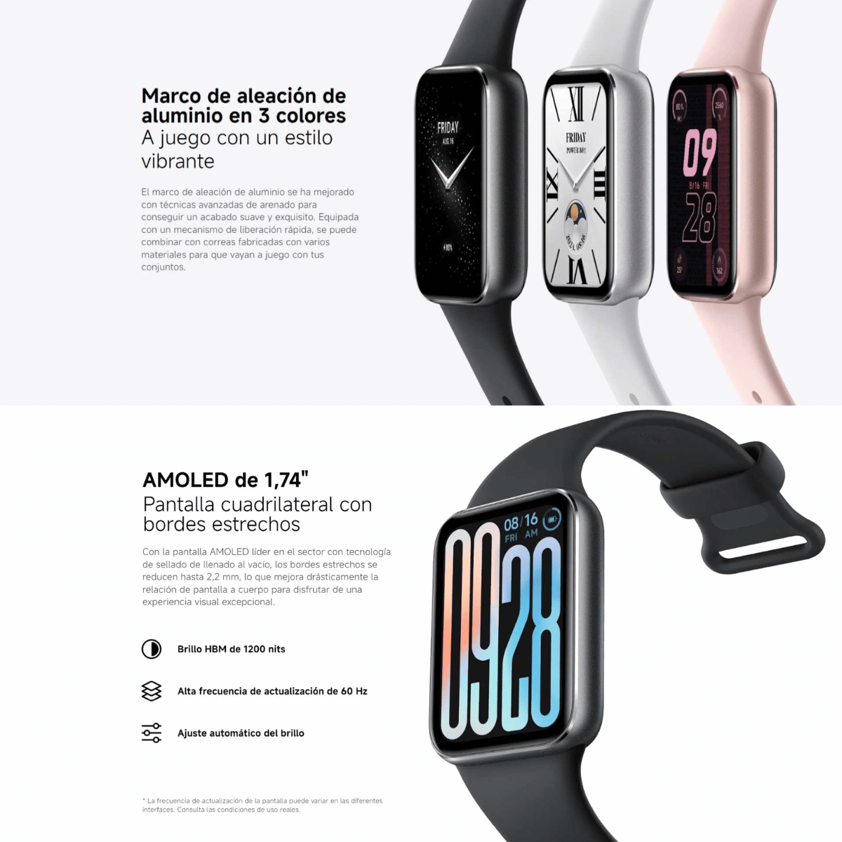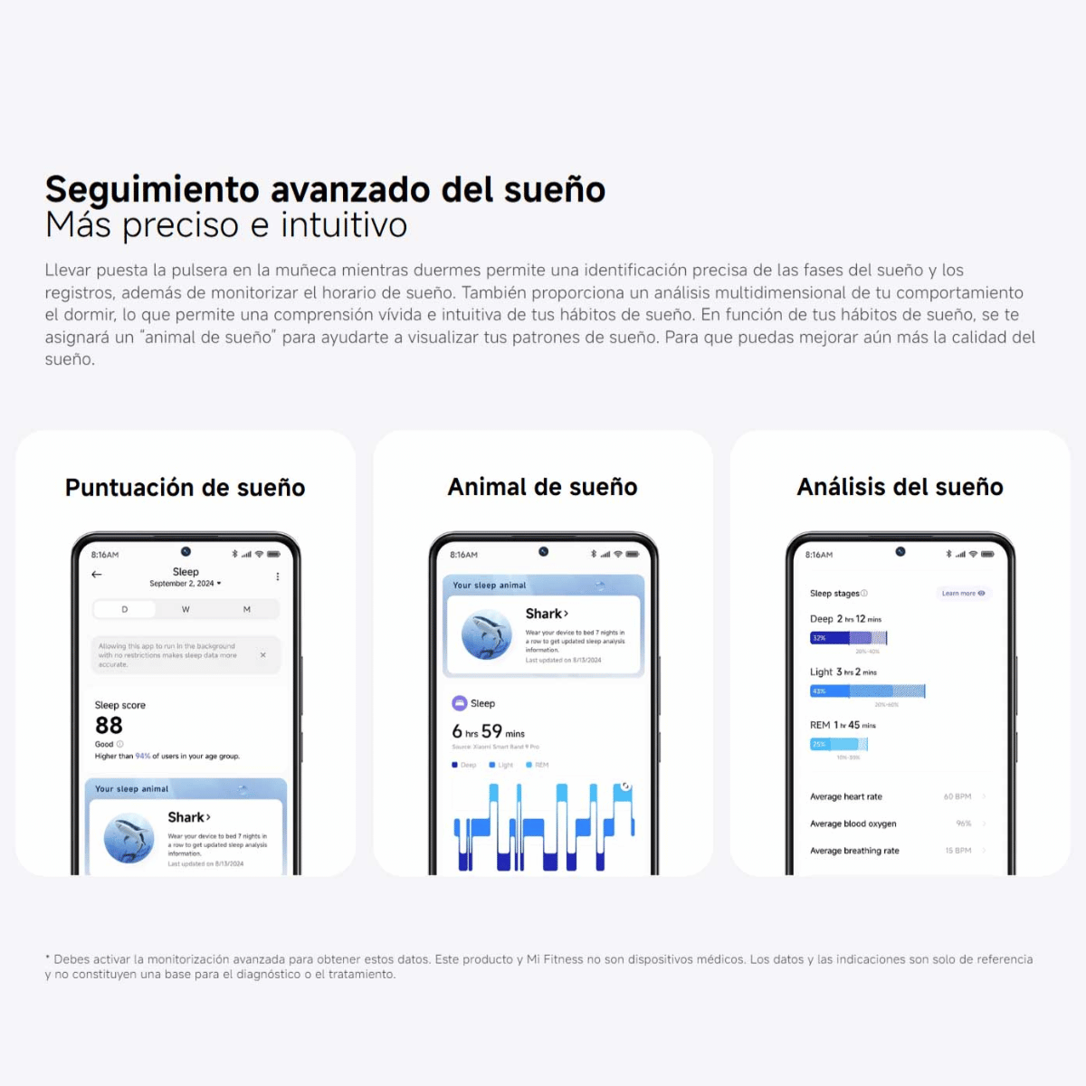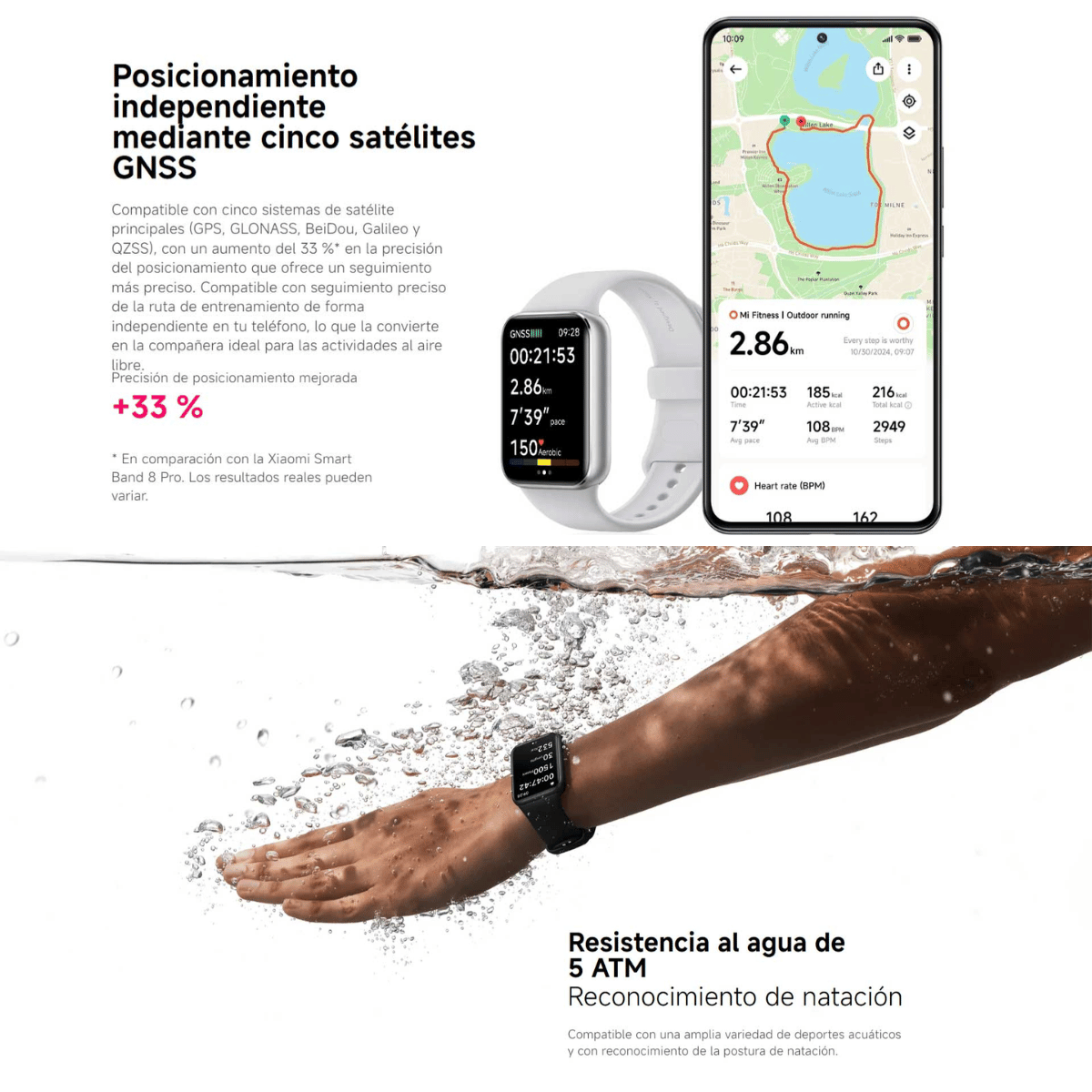 * Resistencia al agua de 5 ATM: la Xiaomi Band 9 Pro cuenta con una resistencia al agua de 5 ATM (50 metros de profundidad). La pulsera se puede usar en piscinas, al nadar cerca de la orilla o durante otras actividades acuáticas poco profundas. Sin embargo, no se puede utilizar en duchas de agua caliente, saunas o al bucear. Además, evita que la pulsera reciba el impacto directo de corrientes rápidas durante deportes acuáticos. El nivel de resistencia al agua no es permanente y puede disminuir con el tiempo.