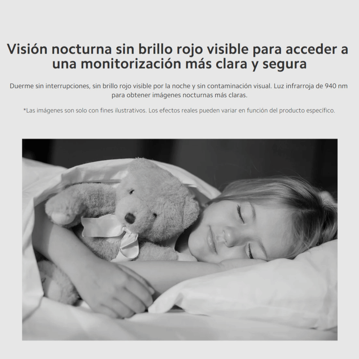 Visión nocturna sin brillo rojo visible para un monitoreo más claro y seguroDuerme sin interrupciones, sin brillo rojo visible por la noche y sin contaminación visual. Luz infrarroja de 940 nm para imágenes nocturnas más claras.